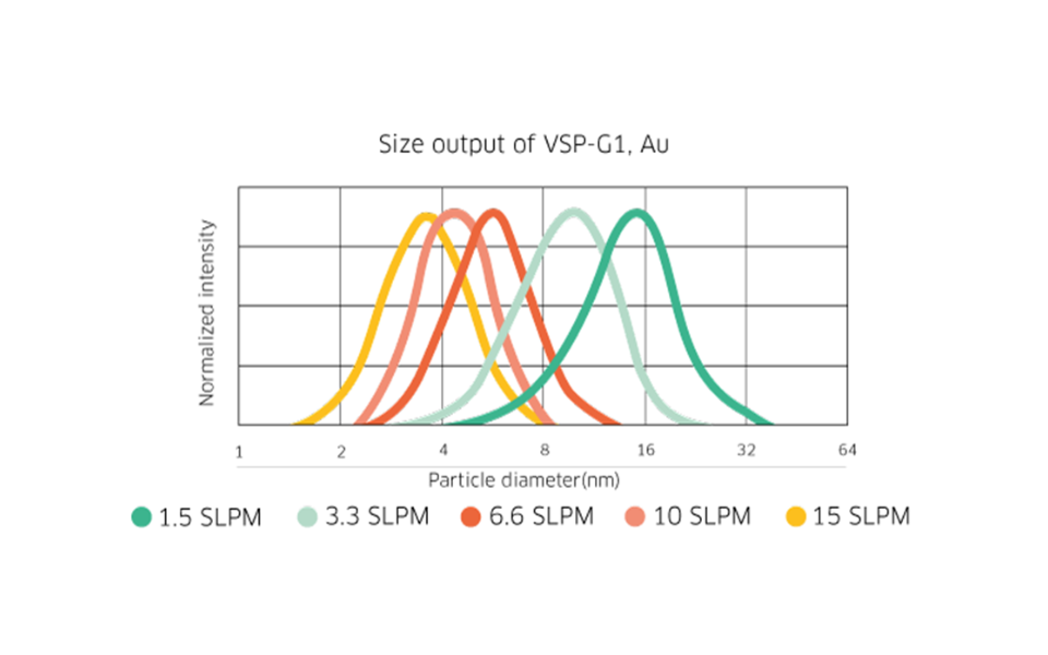 VSP-G1 最有價值的一點是能夠調整所生產納米粒子的平均粒徑。這是通過改變氣體流速來實現的,當然這會影響納米顆粒在反應器內的停留時間。 較低的流速通過為初級顆粒提供更多的時間來凝并,從而導致較大的平均粒徑,而較快的流速可產生較小的顆粒。根據準備的樣品類型(例如 TEM 網格或多孔涂層),還可以調整總功率以改變產率。更高的電壓/電流組合帶來更高的燒蝕率和更大的顆粒。 氣溶膠技術區別與其它真空氣相技術的最大特點便是在常壓下利用氣體有效影響納米顆粒的生長與傳輸過程。