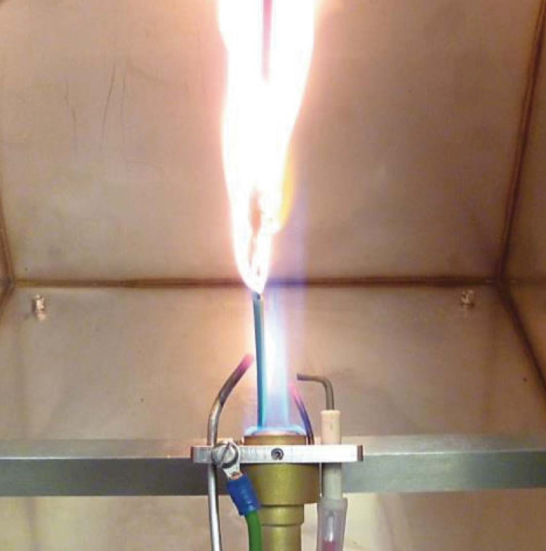 試驗方法將一根60cm長的試樣垂直固定在前壁開通的金屬箱內,固定端上部和下部距離在550mm,固定試樣時使試樣下端距離金屬箱底面約50mm。火焰長度175mm的丙烷燃燒器從距試樣的上部固定端450mm的位置上火焰錐與電纜以45度角接觸。用鋒利的物體按壓電纜表面,如果彈性表面在某點變為脆性(粉化)表面,則表明該點既是炭化部分起始點。如果炭化部分距離固定端下部不超過50mm,則電線電纜通過試驗。