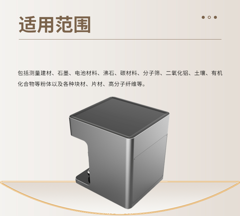1. 適用產品多:包括測量建材、石墨、電池材料、沸石、碳材料、分子篩、二氧化鋁、土壤、有機化合物等粉體以及各種塊材、片材、高分子纖維等。