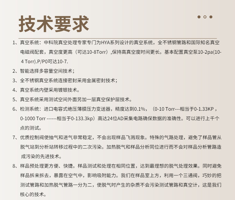 1. 真空系統:中科院真空處理專家專門為HYA系列設計的真空系統,全不銹鋼管路和國際知名真空電磁閥配套,真空度更高(可達10-8Torr),保持高真空度時間更長。基本配置真空泵10-2pa(10-4 Torr).P/P0可達10-7.