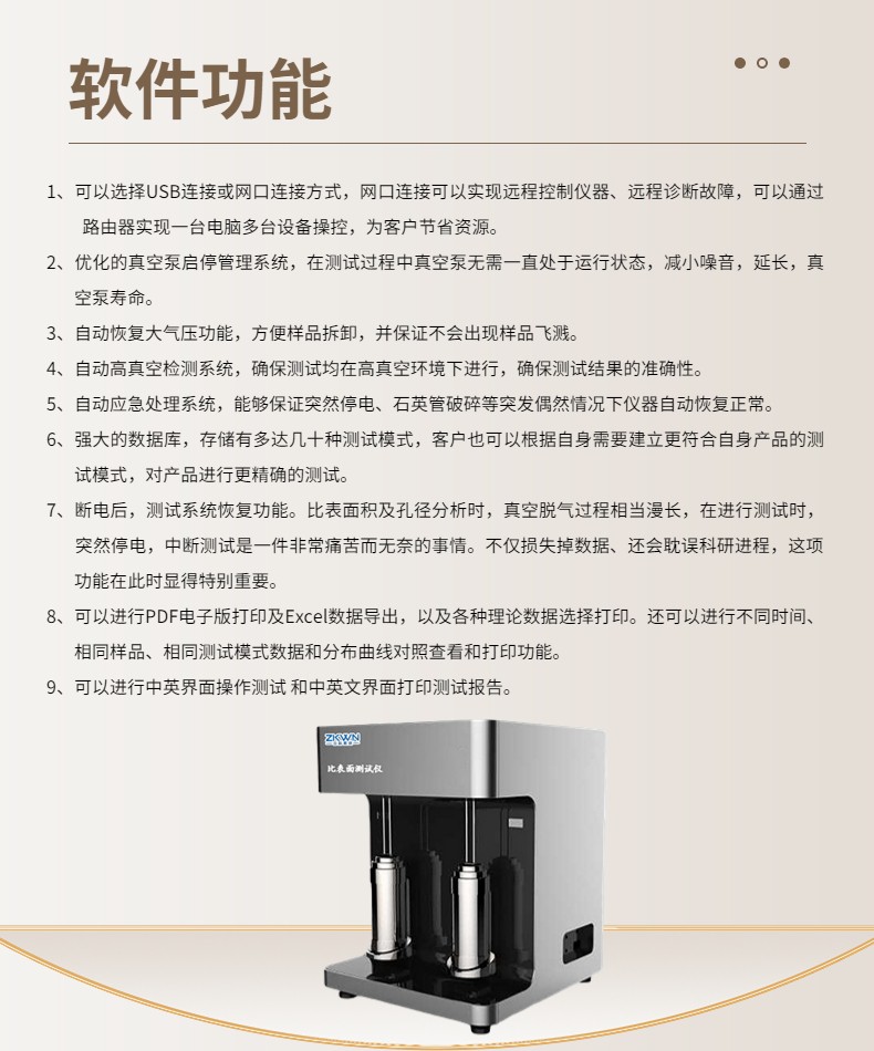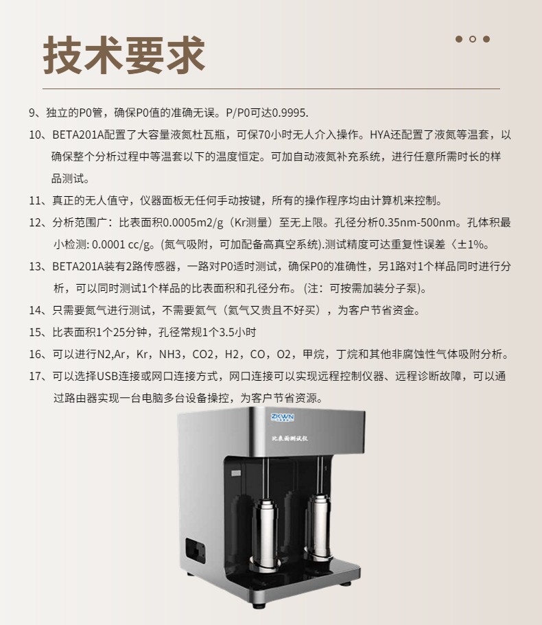 12. 分析范圍廣:比表面積0.0005m2/g(Kr測量)至無上限。孔徑分析0.35nm-500nm。孔體積最小檢測: 0.0001 cc/g。(氮氣吸附,可加配備高真空系統).測試精度可達重復性誤差〈±1%。