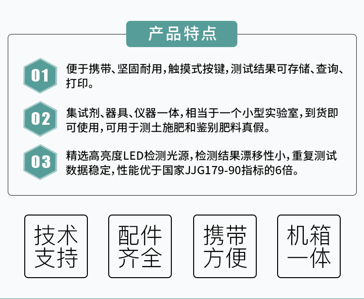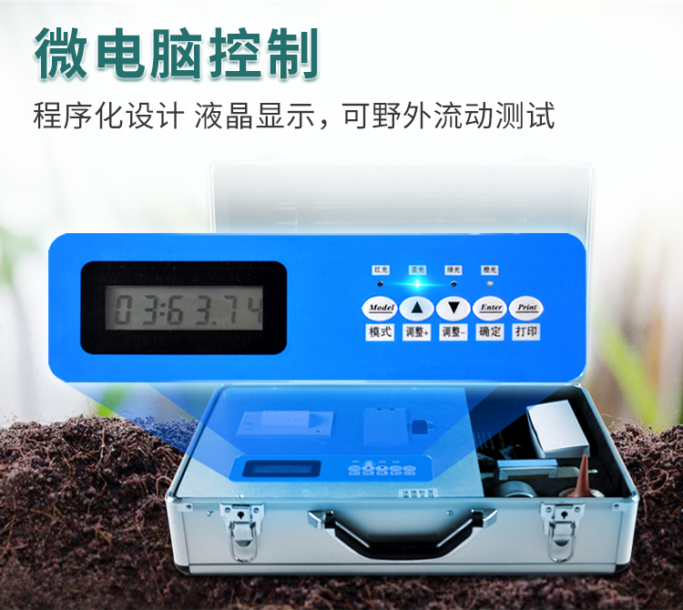 土壤肥力測(cè)試儀可檢測(cè)土壤及化肥、有機(jī)肥、植株中的SX氮、有效磷、SX鉀、全氮、全磷、全鉀、有機(jī)質(zhì)含量,土壤酸堿度,含鹽量(擴(kuò)展)。微電腦控制,數(shù)字化線路、程序化設(shè)計(jì),液晶顯示,交直流兩用,可野外流動(dòng)測(cè)試,大程度降低操作者的失誤和勞動(dòng)強(qiáng)度。